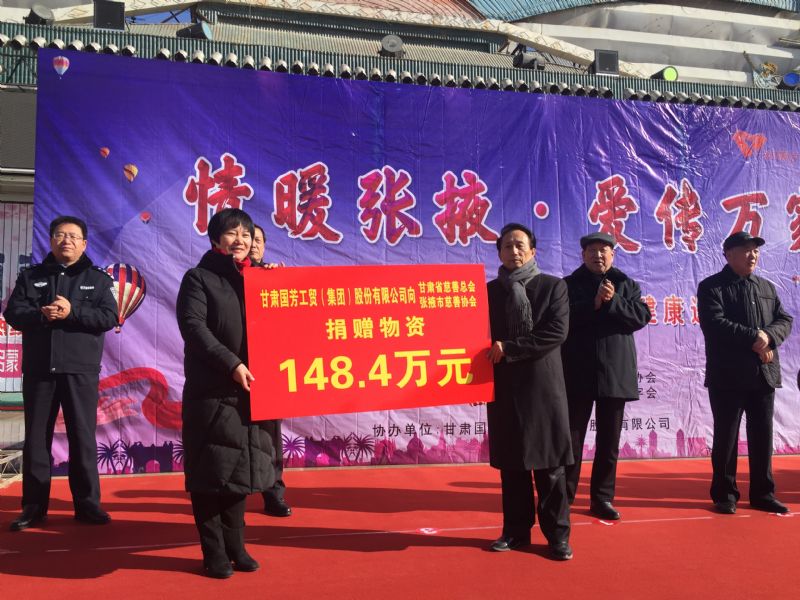 2019年1月11日,甘肅省慈善總會、張掖市慈善協(xié)會、甘州區(qū)慈善協(xié)會以及臨澤縣紅十字會攜甘肅國芳工貿(集團)股份有限公司在張掖市中心廣場共同舉行“情暖張掖·愛傳萬家”送健康送溫暖活動,將2000套棉衣,2000余套秋衣秋褲,27臺彩電以及300余件小家電合計價值148萬元的過冬物資帶給山丹縣,民樂縣的困難群眾,將2500個醫(yī)藥箱帶給臨澤縣的老人們。此次活動傳導社會幫扶、精準扶貧精神的同時也默默為社會傳導著一份正能量。