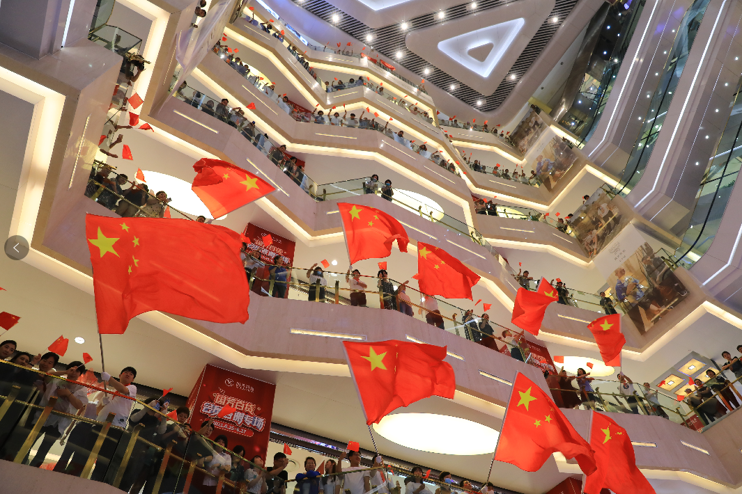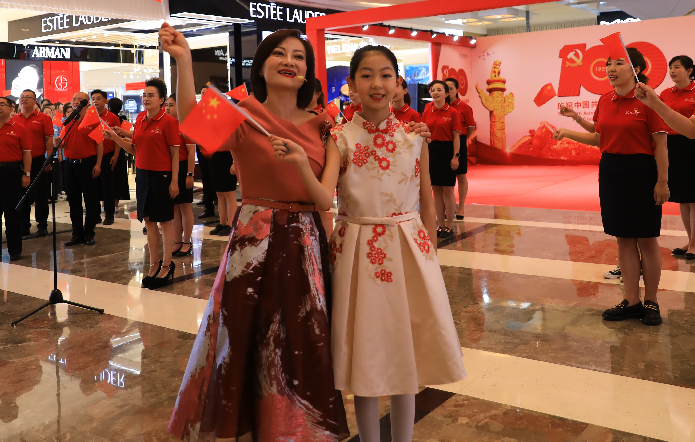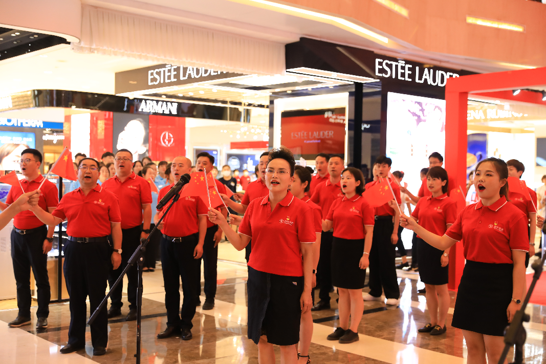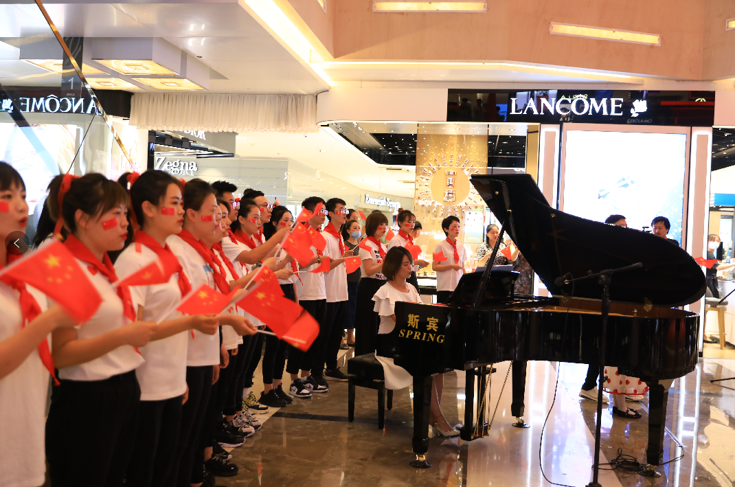 國芳百貨中廳,隨著鋼琴聲響起,活動在男、女領(lǐng)唱“歌唱我們親愛的祖國,從此走上繁榮富強”的歌聲中拉開了活動的序幕,30余名國芳集團黨員及員工代表緩緩向主舞臺走來,大家手持國旗,組合成“100”字樣,神采奕奕,高聲齊唱。與此同時,現(xiàn)場的圍觀顧客也紛紛加入到隊伍當(dāng)中,為演出錦上添花。