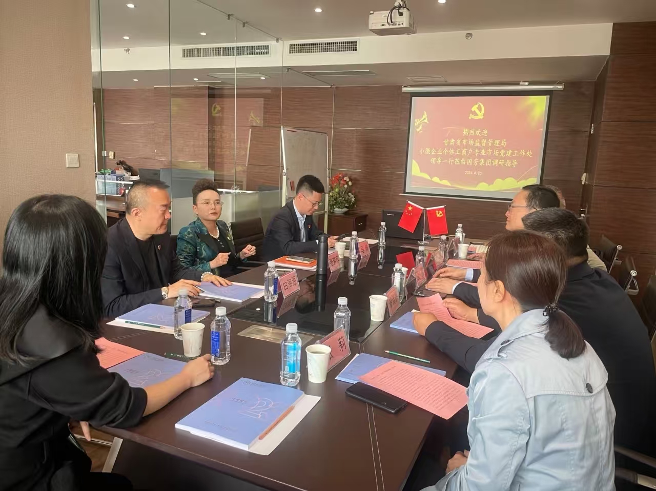 2024年4月26日,甘肅省市場(chǎng)監(jiān)督管理局小微企業(yè)個(gè)體工商戶(hù)專(zhuān)業(yè)市場(chǎng)黨建工作處侯巍處長(zhǎng)與省、市、區(qū)、街道四級(jí)市場(chǎng)監(jiān)管局非公有制經(jīng)濟(jì)黨建處室相關(guān)負(fù)責(zé)人一行蒞臨國(guó)芳集團(tuán)黨委進(jìn)行調(diào)研指導(dǎo)并座談交流。