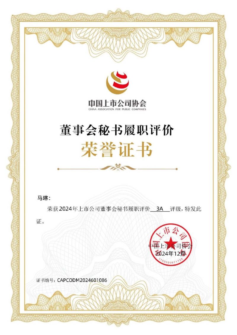 中上協(xié)發(fā)布丨公司榮獲“2024上市公司董事會秘書履職評價”3A評級